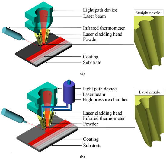 As shown in Figure 2a, the laser cladding equipment (Shaanxi Tianyuan-LCD, Shaanxi Tianyuan Intelligent Remanufacturing Co., Ltd., Xi’an, China) was used to prepare the coatings, and high-purity N2 and Ar was used as the working and shielding gas, respectively. Fe-based alloy powder was feed through the coaxial gravity feeding (marked as GF) with straight nozzle, and Table 5 lists the process parameters. As shown in Figure 2b, the high-speed powder feeding (marked as HF) system (Xi’an University of Architecture and Technology, Light Alloy Rapid Additive Manufacturing Technology R&D Center, Xi’an, China) was mainly composed of a high-pressure chamber and convergent-divergent Laval nozzles instead of straight ones. The working gas through the high-pressure chamber was N2, and the gas preheating temperature and gas pressure was set at 300 °C and 8 bar, respectively. During the laser cladding process, the deposition temperature was measured in real time by infrared thermometer. The motion control system was a 6-axis vertical articulated robot (Motoman-AR1440, Yaskawa Electric Corporation, Shanghai, China), with a control accuracy of 0.01 mm. Table 6 lists the process parameters of the HF process.