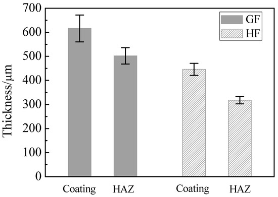 Figure 4 shows the cross-sectional microstructure of coating/substrate interface under different processes, and the heat-affected zone (HAZ) was labeled. The wave shape appears at the interface between the coating and the substrate, which is caused by the gradual decrease of the laser energy density distribution from the center to the periphery. Therefore, the bottom boundary of the heat affected zone also presents a shallow wave shape [21]. After five measurements for each sample, the average thickness of the coating and HAZ is obtained, and the thickness results are shown in Figure 5. It can also be seen that the thickness of the HF coating (446 μm) is smaller, compared with the GF coating (615 μm). During the process of HF, some larger particles rebounded during high-speed particle impact, resulting in a lower coating thickness [22]. According to the thickness of HAZ in Figure 4, it can be seen that HAZ of GF (502 μm) is greater than that of HF (317 μm). The reason for this phenomenon is that the heat input of the GF process is 1.3 times that of the HF process, resulting in more heat absorbed by the substrate [23].