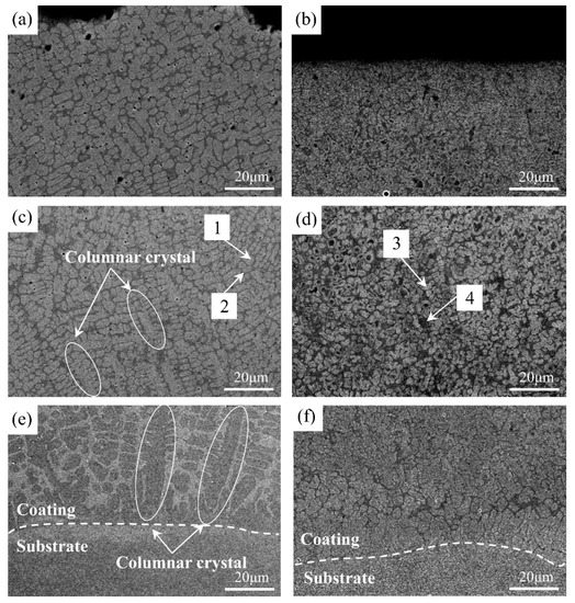 Figure 6a,c,e shows the cross-sectional microstructure of the bottom, middle and top of the coating under the GF process. It can be seen that different regions correspond to different morphologies. Since a high energy density laser beam is introduced in the GF process, the purpose of rapid heating and rapid solidification can be achieved in the process of preparing the coating, so the GF solidification structure grows from the bottom of the molten pool to the top. Meanwhile, the solidification characteristics of the GF coatings strongly depends on the value of G/R (G represents the temperature gradient; R represents the solidification rate). According to Figure 7, it can be seen that different G/R values correspond to different morphologies of solidified structures [20,24]. The value of G/R is larger at the bottom of the molten pool, and the crystal growth rate at this time is much greater than the nucleation rate, so the grains grow into coarse columnar crystals [25]. For the top of the coating, due to the smaller G and the larger R, the growth rate of grains is lower than the nucleation rate. Therefore, the grains mainly grow into small columnar crystals, and they tend to grow in a certain direction [26]. Figure 6b,d,f shows the cross-sectional microstructure of the bottom, middle and top of the HF coating. The HF coating exhibits a completely different morphology from the GF coating, and no columnar crystals were found, mainly composed of fine grains.