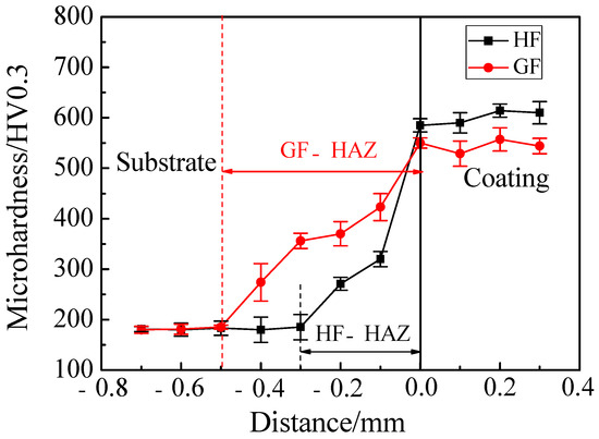 Figure 10 shows the microhardness distribution curve of the HF and GF coatings along the depth of the layer. It can be observed that the microhardness distribution of the HF and GF coating presents three areas, which are the coating, the HAZ and the substrate. The result shows that the average microhardness of 27SiMn steel substrate is 175 HV0.3. The average microhardness of the HF coating is 604 HV0.3 and is 9.4% higher than that of the GF coating (543 HV0.3). Because the substrate absorbs part of the heat generated by the laser during the laser cladding, a transition zone (HAZ) is generated at the lower part of the interface, and the microhardness of HAZ will gradually decrease and approach the substrate. During the HF process, due to the impact of the high-speed running powder, the microstructure of the coating changes from coarse columnar crystals to fine grains. In addition, the HF process has a faster scanning speed, which increases the cooling rate of the coating during solidification. The fast cooling rate is beneficial to the formation of uniform and fine microstructure during the cladding process, which also improves the microhardness of the coating [34].