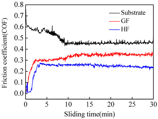 The friction coefficient curve of the substrate, GF and HF coating.