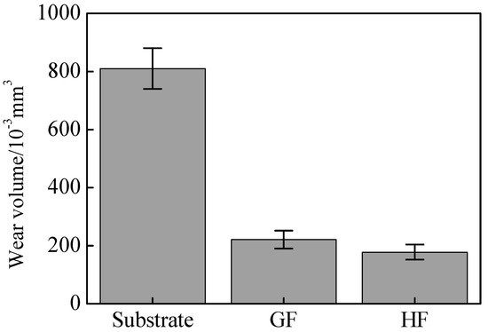 In comparison, the wear curves of the HF and GF coatings and the 27SiMn steel substrate are quite different. In the initial stage of wear, the friction coefficients rapidly increase from 0 to 0.27 and 0.30, respectively. The coating with higher hardness makes the pressing depth of the grinding ball shallow, resulting in less resistance f to the grinding ball during the friction stage. Through the cyclic wear of the grinding ball on the surface of the substrate, the contact area between the grinding ball and the surface of the substrate gradually becomes smooth, so the friction coefficient gradually increases. Finally, the COF of the HF and GF coatings stabilized at around 0.23 and 0.37, respectively. Due to the surface peeling and wear of the coating during the friction process, the COF will fluctuate, but the friction curve of the HF coating is the most stable. The wear volume of the 27SiMn steel substrate, the HF and GF coatings is shown in Figure 13. It can be noted that the HF coating has the lowest wear volume. The wear volume of the HF coating and the GF coating are 21.9% and 27.2% of the 27SiMn steel substrate, respectively, indicating that the wear resistance of the HF coating was better than that of the traditional GF coating. In the study of Kalyanasundaram et al. [35], they deposited diamond on the aluminum alloy substrate by electrodeposition technology. After conducting nanoindentation and wear experiments, they found that as the microhardness increases, the friction coefficient of the coating reduces from 0.60 to 0.32. Experience has proved that the microhardness of the coating is the main factor that determines the wear resistance, and the increase of the microhardness of the coating will increase the wear resistance.