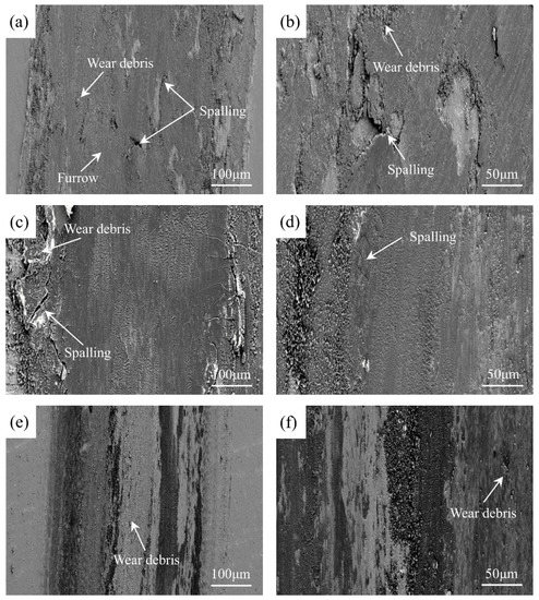 Figure 14 shows the wear morphology of the coating and substrate surface. It can be seen from Figure 14a,b that there are obvious grooves and adhesive peeling on the surface of 27SiMn steel, which indicates that abrasive wear and adhesive wear have occurred during the wear process. Due to the harder grinding balls being pressed into the 27SiMn steel to a certain depth, adhesion is formed on the surface of the substrate. The material on the surface of the substrate peels off after undergoing plastic deformation, and the smaller abrasive debris plow the surface and form furrows. With the cyclic movement of the grinding ball, a large area of peeling occurs on the surface of the substrate, so the wear loss of the 27SiMn steel substrate is relatively large.