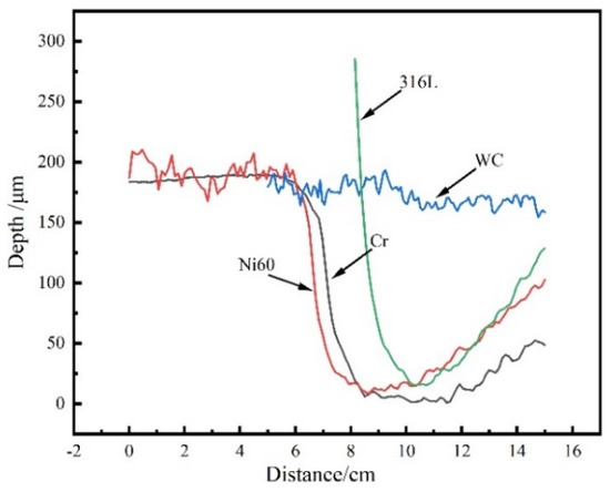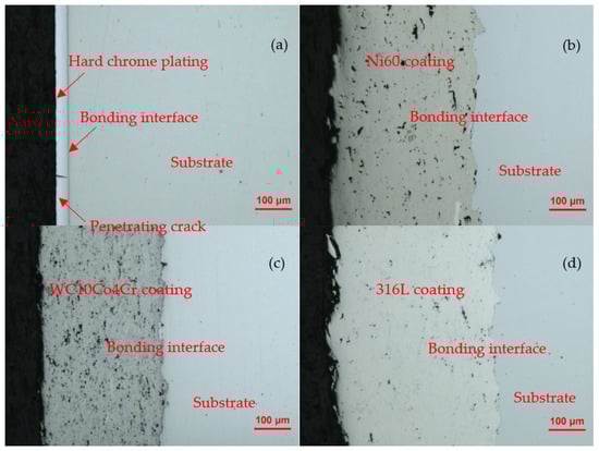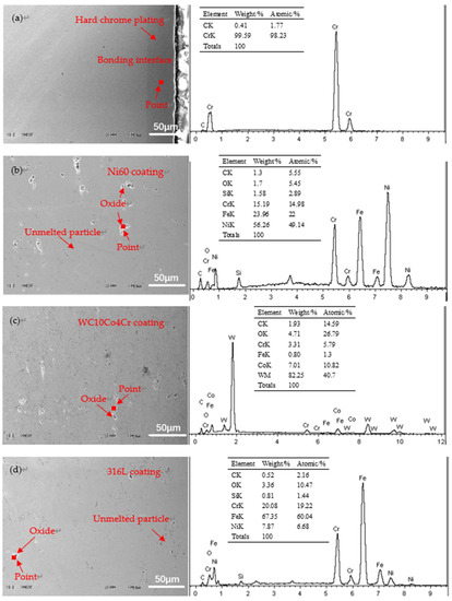 - There is a microcrack in the plating. The thickness of the plating is 26–28 μm, and the microhardness is 778.6 ± 25.4 Hv300. The thickness of the HVOF coating is 420–450 μm, and the coating structure is uniformly compact without an obvious crack or pore in the internal part. The bonding interface between the coating and basal body is closely combined and embedded with each other, and the binding method is mechanical occlusion. The microhardness of HVOF coatings ranked from high to low is WC10Co4Cr coating, Ni60 coating, and 316L coating; the values are 1163.6 ± 12.4 Hv300, 817.5 ± 18.3 Hv300, and 476.4 ± 29.7 Hv300, respectively.
