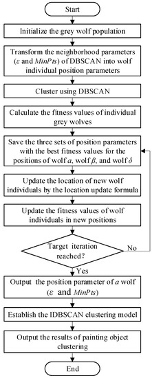In this paper, DBSCAN is improved based on GWO to obtain more accurate ε and and make the clustering results of painting objects more precise. The computational flow is shown in Figure 2.