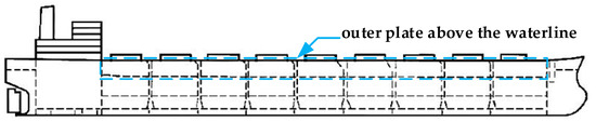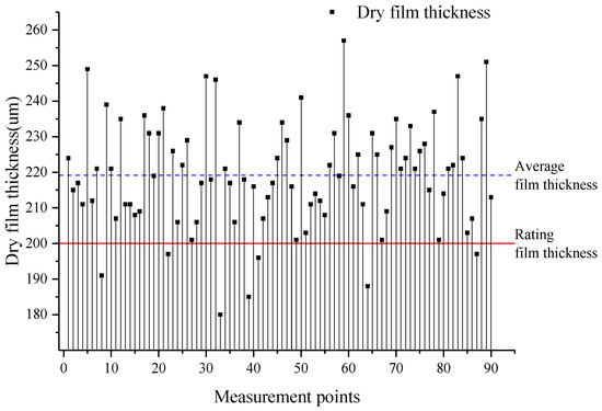 As can be seen from the Figure 8, the average film thickness is 219.19 µm and the maximum film thickness deviation is 77 µm. The rating film thickness of the primer for the outer plate above the waterline is 200 µm, as specified in the coating matching table for the H1127/7 type ship. According to the PSPC standard, the dry film thickness should satisfy the 90/10 principle [40]. That is, the dry film thickness of more than 90% of the test points is not less than the specified film thickness and the dry film thickness of the remaining test points is not less than 90% of the specified film thickness. As can be seen from the table, 92.3% of the measurement points achieved the rating dry film thickness. Moreover, the dry film thickness of seven measurement points failed to reach the rating film thickness. However, the dry film thickness of these seven points also reached 90% of the rating film thickness, which is in accordance with the PSPC standard. Therefore, the dry film thickness of these seven points also meet the construction requirements of the shipyard.