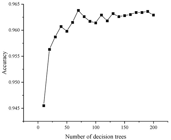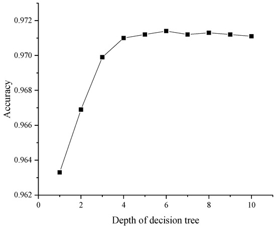 To analyze the effect of the maximum depth of decision tree on the classification results, set the minimum sample required for internal node re-division as 2, the minimum sample of leaf nodes as 1, the number of decision trees , the maximum depth of decision tree . The results of the maximum depth of decision tree optimization are shown in Figure 5. As can be seen from the figure, the classification accuracy varies significantly with the depth of the decision tree when . After that, the variation of the accuracy rate gradually smoothed out. When , the accuracy rate reaches the maximum. When the decision tree depth is varied in the range of [4, 10], the accuracy fluctuates in the range of 0.001, indicating that the algorithm has good robustness.