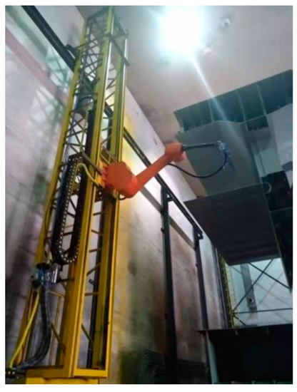 Based on the recommended results, the gun type, nozzle type, nozzle diameter and the number of nozzles are set for the side suspension painting robot. Moreover, painting process parameters such as paint spraying pressure and travelling speed are fed into the side suspension painting robot. The outer plate above the waterline is tested with primer paint, as shown in Figure 6.