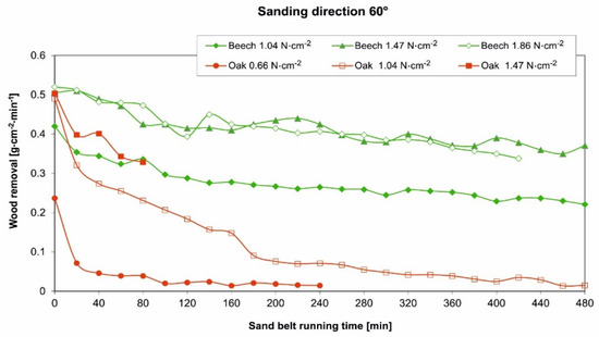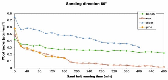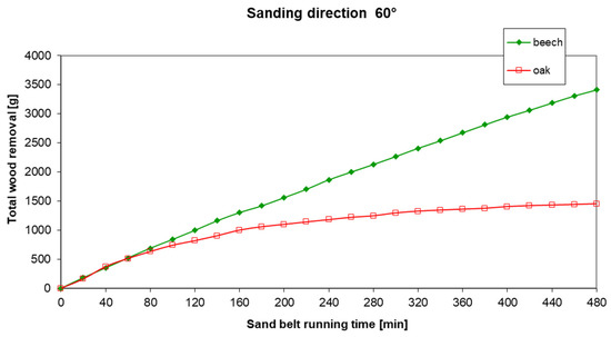 Efficiency of the sanding means is defined by the overall wood removal volume (in grams for the carried-out experiment). Although sharp sanding belts have been used for all variants in the experiment, with the same input characteristics and from the same manufacturer, the overall wood removal values were very different (beech and oak). The total wood removal value for beech wood was approximately twice as high as for oak wood (for example, for the sanding direction 60°; Figure 7). Thus, in terms of overall performance, the wood that must be sanded plays a significant role [34]. This is in agreement with the results of [36], who emphasized that, for the optimum performance of the sanding belt, the various sanding parameters should be considered as a function of the wood species [27].
