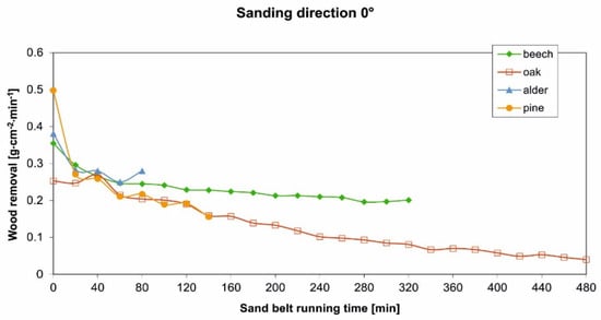 Wear curves for the sanding direction along the wood fibres at 0°—wood removal depended on the sand belt running time.