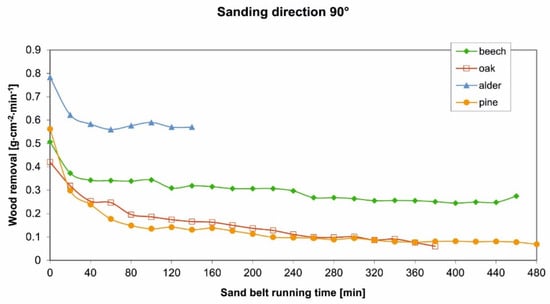 Based on the obtained results, we assume that the machining conditions with this direction of sanding, whether the fibres are pruned, and the deposits and removals of the dust from the inter-chip space are less demanding for all selected woods in comparison to sanding along the fibres, which has been reflected mainly in the extension of the working time of the sanding means and also by higher wood removal values. Deciduous wood with scattered pores (beech, alder) achieves very high wood removal values throughout the obtained working interval of the sanding means: 400 min for alder and 480 min for beech. After the first 20 min of a very sharp decline of the wood removal (the initial sharpness phase), the phase of the work sharpness with a balanced value of the wood removal follows. When sanding the beech wood, the sanding belt would be able to work even after 480 min, because its wood removal value has not fallen below the specified value of ≤0.05 g·cm−2·min−1. When sanding oak wood, from the perspective of the minimal wood removal criterion, the operational life of the sanding means is shorter (compared to the working time of 480 min), about 280–300 min, with the value of the wood removal decreasing to zero, which corresponds to the dulling phase of the sanding means. For pine wood, the working time of the sanding means reached only 160 min, which could be caused by a very high value of wood removal in the initial phase, in combination with the presence of a resin in the pine wood.