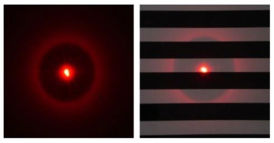 Pictures of the point-spread function of a uniform substrate (image on the left) and a substrate with line-halftone black and white pattern (image on the right) both coated with a clear layer, as displayed when illuminated with a red laser beam.
