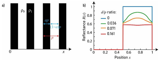 In the end, the multi-convolutive model allows us to determine the reflectance of a coated line halftone, knowing the input parameters: the surface coverage a of the non-coated halftone; the ratio d/p between the thickness of the coating layer, d, and the period of the halftone, p; the intrinsic reflectance ρ0 of the bare substrate; the intrinsic reflectance ρ1 of the full-tone; the optical index n1 of the coating material; the transmittance t of the coating layer and the terms , , , and which are dependent of the measurement geometry. Once all parameters are set except the d/p ratio, it can be shown that the reflectance decreases as this ratio increases. This can be visualized in Figure 3b, where the reflectance profiles of the halftone pattern along the x axis, predicted by the model, are plotted for various d/p ratios. The profiles being periodical, only one period is shown. In this simulation, the substrate has ideal reflectances: and , the coating is perfectly clear: t = 1, the coating’s refractive index is 1.5, the terms , , , and correspond to a de:8° measurement geometry (specular component excluded), the surface coverage of the halftone pattern is a = 0.5.