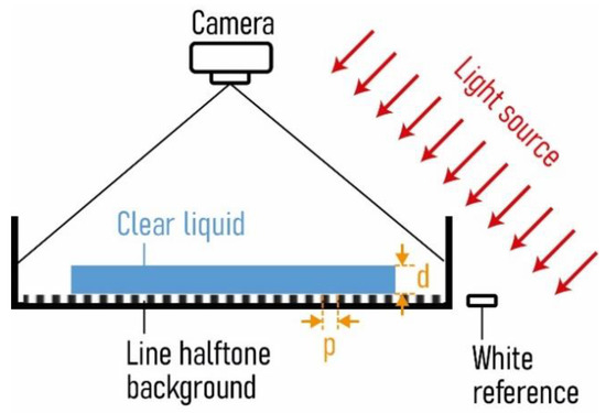In order to avoid any confusion between this effect and dot gain due to light diffusion within the substrate, we chose a configuration where the halftone patterns are very large in comparison to the significant size of the substrate’s point-spread function. The line halftone pattern has a period of 33.3 mm, composed of large black and white lines. A liquid was gradually poured on the halftone to generate multiple thicknesses of clear coating layers. For each coating thickness, the halftone was captured through a camera. Each thickness was derived from the size of the halo generated by a laser beam and captured with a handheld camera. The experimental setup is displayed in Figure 4.