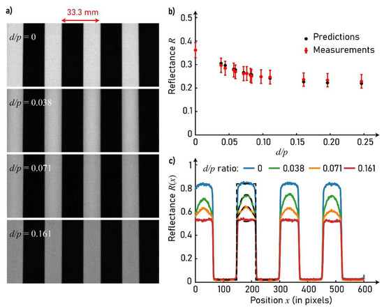 (a) Pictures of the halftone pattern when uncovered and covered by a layer of clear liquid (optical index of 1.5) with increasing thickness, yielding four different d/p ratios; (b) comparison between measured and predicted reflectances of the coated support for different d/p values; (c) reflectance profiles extracted from the images displayed in (a) for the different d/p values (colored solid lines) and profiles predicted by the model for the same d/p values and the same reflectance values on the uncoated support (black dashed lines).