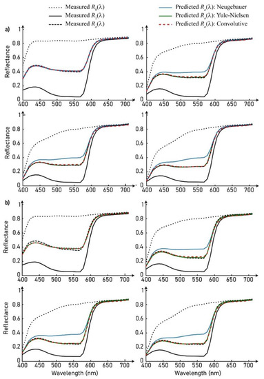 The measured reflectances were compared with classical reflectance models, the spectral Neugebauer model and Yule–Nielsen modified spectral Neugebauer model [40], as well as the multi-convolutive model (Equations (10) and (12)) introduced in the previous sections.