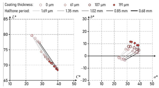It can be observed in the L*C* plane that, as the coating thickness increases, the halftone color becomes darker and more saturated, which is linked with the higher probability for light to meet a neighboring ink pattern. The a*b* plane shows that the color of the halftones also becomes more yellowish as the varnish thickness increases, which is due to the absorptance of the varnish.