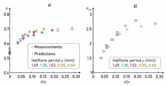 We can also verify that the darkening effect can be considered as an optical dot gain effect. The parameter of the Yule–Nielsen model which is a marker of optical dot gain [31,40], is displayed Figure 8b as a function of the d/p ratio of each coated patch. We observe as expected that increases as d/p increases, which corroborates the trends evocated above.