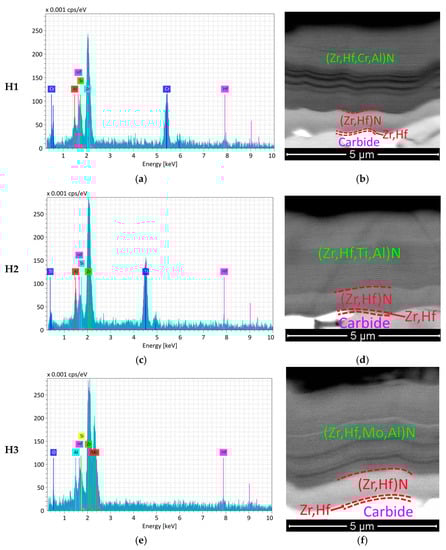 The results of the analysis of the composition (left) and functional layer structure (right) of the investigated coatings (SEM-BSE). (a) H1 composition; (b) H1 structure; (c) H2 composition; (d) H2 structure; (e) H3 composition; (f) H3 structure.