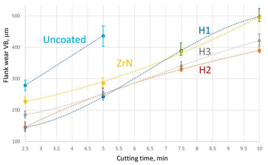 - After 5 min of cutting, the average flank wear VB detected for the uncoated tool was 1.8 times higher than that for the tools with Coatings H1, H2, and H3 and 1.5 times higher than for the ZrN-coated tool. For the tools with Coatings H1, H2, and H3, the rate of wear was in average 1.2 times lower after 5 min of cutting in comparison with that for the tool with the commercial ZrN coating. The ZrN-coated tool and the tool with Coating H1 demonstrated the tool life 1.5 times higher, and the tools with Coatings H2 and H3–2 times higher compared to that of the uncoated tool;