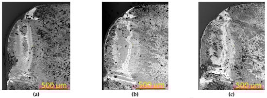 We consider in more detail the patterns of rake wear for the tools with considered Coatings H1, H2, and H3 after 10 min of cutting (Figure 3). An obvious notch wear is typical for the rake face, while no formation of noticeable wear crater is detected. Such a pattern of wear is typical for high cutting speeds and, respectively, active diffusion and oxidation processes at elevated temperatures [,]. The specimens with Coatings H1, H2, and H3 demonstrate fairly close patterns of wear. However, for the specimen with Coating H3, the wear rate is slightly higher (KB = 520 μm) than for the specimens with Coatings H1 and H2 (KB = 450 μm). In terms of notchwear, the more active wear was detected on the specimens with Coatings H1 and H2, while the specimen with Coating H3 demonstrated less active wear.
