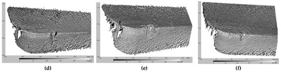 Pattern of rake wear after 10 min of cutting for the tools with (a,d) Coating H1, (b,e) Coating H2, and (c,f) Coating H3.