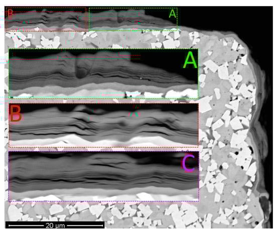 Pattern of wear for the tool with Coating H1 after 10 min of cutting. Large longitudinal cracks: (A) area A; (B) area B; (C) area C. Area C is located to the left of the area under consideration (SEM-BSE).