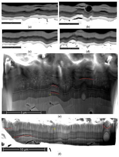 The structure of the coating hardly contains any transverse cracks (Figure 5), the formation of which contributes to a larger degree to the fracture of the coating and failure of the cutting tool []. According to the analysis of the data exhibited in Figure 4 and Figure 5, the dominant direction of crack propagation in Coating H1 is the direction parallel to the surface of the substrate. The nanolayer structure of the coating does not have any noticeable effect on the pattern of crack propagation. Cracks propagate by cutting through the nanolayers of the coating. The Focused Ion Beam (FIB) cross-section analysis of the coating (Figure 5e,f) also detects a number of longitudinal cracks, which can indicate that the cracks are contained in the structure of the coatings, rather than being formed during the obtaining of the cross-sections for SEM.