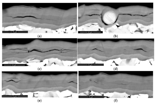 The patterns of cracking slightly differ for Coatings H1 and H2. In particular, a slightly less active cracking takes place in Coating H2, with interlayer delaminations dominating, rather than longitudinal cracks (Figure 6 and Figure 7).