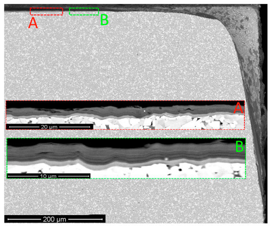 Pattern of wear on the tool with Coating H3 after 10 min of cutting (SEM-BSE). Preferably delamination between nanolayers: (A) area A; (B) area B.