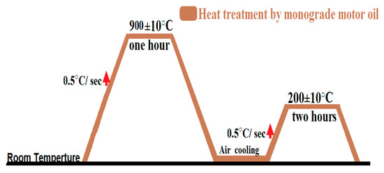 The heat treatment process was applied at two stages. The first stage was to subject all the investigated samples to high temperature = 900 ± 5 °C, using the digital Muffle furnace Model: FHPX-12) made by the DAIHAN SCIENTIFIC CO for complete 60 min. All samples were then removed from the digital furnace red and hot and quenched carefully inside one litre of mono-grade motor oil, with a viscosity of 40 poise at room temperature for 10 min. At the second stage, all samples were washed carefully using hexane alcohol purity ≈ 99 wt.%, followed by ethyl alcohol purity 99 wt.%, to remove any unwanted precipitates over the surface of treated samples. Finally, all the investigated samples were exposed to another heat treatment step: tempering at a lower temperature 200 ± 10 °C for 120 min inside an oven type Fresh, and then left to cool freely to room temperature. Figure 1 represents the applied stages during the complete heat-treatment process.