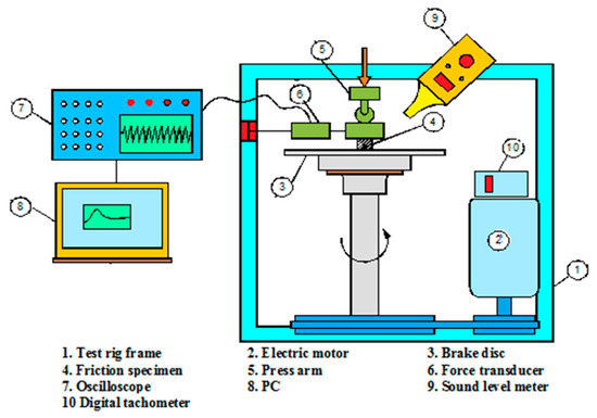 The tribological analyses, involving the specific abrasive wear rate, the specific lubricant wear rate, and friction coefficient measurements, were applied using the pin on disk tribometer, as shown in Figure 2 [25]. The test is applied by subjecting each investigated sample to a pressure = 0.5 MPA of an automobile hard grey cast iron disk moving at 7 m/s sliding speed for 18 min at room temperature 27 ± 3 °C. The abrasive dry wear conditions were executed by applying the test without any lubricant. The lubricant wear conditions were applied in conjunction with the flow of 25 wt.% glucose solution with viscosity 17.41 poise, pH = 5.57, and glucose flow rate 1.2027 mL/min. The PH parameter value of the lubricant was measured using a Jenway PH meter, and the viscosity was investigated using a viscometer type: first touch serial no 15.05TFO22 Lamy rheology instruments. It is very important to polish and clean the rotor disc friction area using 320 abrasive grid paper and pure acetone before the beginning of the wear test for the next investigated sample, to forbid any unwanted residues and achieve the best quality for the applied measurements.