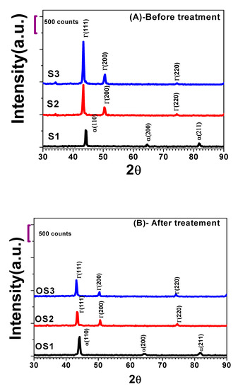 Figure 3 shows the X-ray diffraction patterns at the 2θ range from 30° to 90° for all the studied stainless steel grades, where part (A) represents the untreated S1, S2 and S3 samples and part (B) displays the heat-treated samples OS1, OS2 and OS3. Although all the selected materials are mostly stainless steel alloys with comparable densities, the diffraction patterns produced for each sample are not unique. S1 is a Martensitic stainless steel grade characterised by a base-centred cubic structure with reflection planes (110), (200) and (211) [6], whereas S2 and S3 are austenite stainless steel grades defined by a face-centred cubic structure with reflection planes (111), (200) and (220). Furthermore, S1 prefers the alpha (110) direction planes; however, S2 and S3 choose the gamma (111) direction planes [14,15,16,17,18,26].