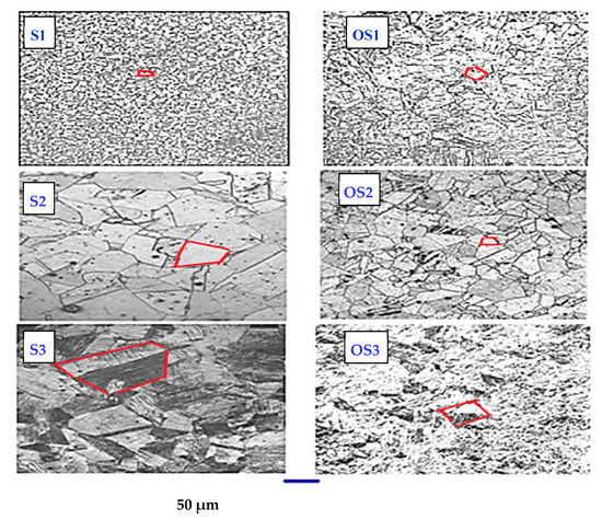 It can be seen from Table 2 that the texture coefficient and crystallite sizes of the alpha (110) preferred planes in the OS1 heat-treated martensitic sample are larger than those in the untreated S1 sample. On the other hand, the texture coefficient and crystallite size of the gamma (111) preferred planes in OS2 and OS3 heat-treated austenite samples are smaller than those in the untreated S2, S3 samples. The FWHM was decreased for the OS1 following the heat treatment process and increased for the OS2, and OS3 treated samples. It can be concluded that the heat treatment process for the Martensitic sample Sl led to the formation of the hardened martensitic phase, which is harder and more crystalline than the other retained austenitic phase initiated for the austenite stainless steel OS2 and OS3 samples after the heat treatment process. As illustrated in Figure 3, sample S1 has a predominantly bcc martensitic microstructure, with an average grain size of ≈8 µm, whereas the heat treatment process increased the grain size of the heat-treated grade OS1 to ≈42 µm due to the formation of the new tempered and more crystalline hardened martensitic phase, which is known for its high mechanical resistance, tensile nature, and toughness [7]. Meanwhile, the grain size of the untreated austenite sample S3 was ≈83.48µm, which was reduced to ≈58.64 µm for heat-treated samples OS3, owing to the formation of the weak and retained austenite phase after the heat treatment process.