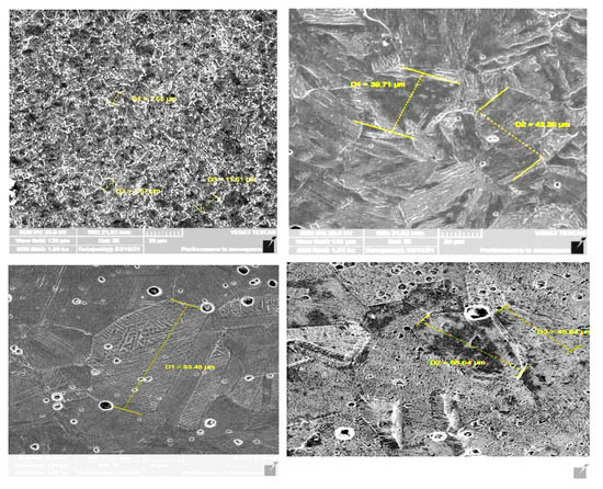 Figure 4 shows the obtained optical surface microstructure for the investigated stainless steel alloys using the Trinocular polarizing microscope type (Fluoroscope-Polar T/R, made by Ray wild) at the magnification 20×. Meanwhile, Figure 5 represents a higher magnification scale = 1K× using the scanning electron microscopy instrument type VEGA3 TESCAN) to show the obtained the grain size for both of the martensitic and austenitic samples S1 and S3, before and after the heat treatment process.