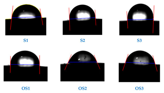 The average surface roughnesses for heat-treated austenite stainless steel grades OS2 and OS3 have lower values compared to the untreated austenite stainless steel samples S2, S3. Meanwhile, the heat-treated sample OS1 has a higher average surface roughness following the heat treatment process compared to the untreated martensitic sample S1. Moreover, the wettability characteristics of the investigated materials include both contact angle and work of adhesion for a drop of 25 wt.% glucose solution. As shown from Figure 6 and Table 3, the obtained contact angles (°) and work of adhesion (mN/m) measurements for both of the heat-treated austenite stainless steel samples OS2 and OS3 are inversely related compared to those of the untreated samples. According to the previously mentioned status of the OS2 and OS3 samples, it can be concluded that decreasing the average surface roughness reduces the degree of the contact angle between the liquid drop of glucose solution and the examined material surface. As a result, the glucose liquid spreads on the heat-treated austenite materials surface, increasing the degree of adhesion between the glucose liquid and the investigated material surface. Accordingly, the heat-treated austenitic samples OS2 and OS3 become more hydrophilic and softer than the untreated austenite samples S1 and S2. However, a rougher surface, a higher contact angle and a lower work of adhesion are obtained for the heat-treated martensitic sample compared to the untreated one. Consequently, the heat-treated sample OS1 is more hydrophobic and rougher than the untreated martensitic sample S1. These results match those of previous studies that used the Wenzel and Cecil wettability calculation methods [11,31].