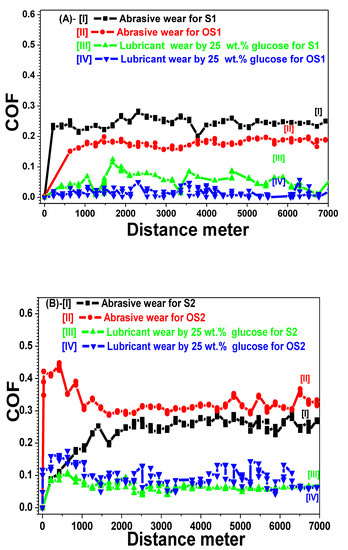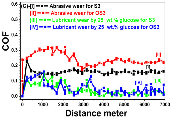 Secondly, the lubricant wear condition against the flow of 25 wt.% glucose solution is depicted in Figure 7A-III. The COFLS1 curve decreased sharply compared to the former abrasive conditions COFS1 for the same material, due to the viscous lubricant of 25 wt.% glucose solution flowing at a rate of 1.2027 mL/min. However, there are several zigzag fluctuations in the COFLS1 behaviour, showing the instability of this Martensitic grade against lubricant. These fluctuation drops occurred at (COFLS1 = 0.113, distance = 1682 m), (COFLS1 = 0.0842, distance = 3572 m), (COFLS1 = 0.087, distance = 4623 m) and (COFLS1 = 0.0652, distance = 5582 m). Figure 7A-IV reveals the COFLOS1 behaviour for the heat-treated sample OS1 against lubricant wear conditions. The fluctuations at the COFLOS1 curve were diminished or disappeared compared to the untreated sample COFLS1.