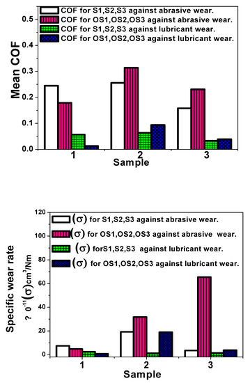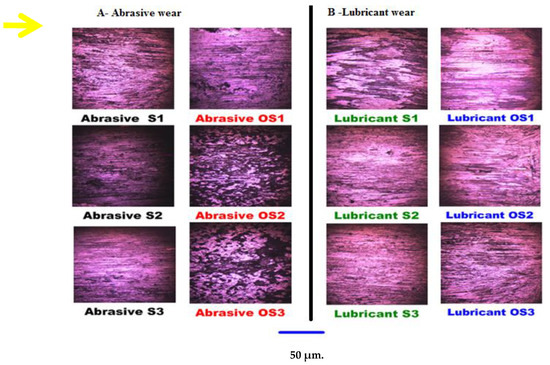 According to the optical micrographs for the investigated samples against lubricant wear conditions using 25 wt.% glucose solution (Figure 8B), the amount of metal transfer and worn volume loss were significantly reduced for all the examined samples compared to the abrasive dry wear conditions because of the viscous glucose solution, which worked as an inhibitor cutting fluid [37]. Additionally, as illustrated in Figure 9 and Table 3, the same behaviour occurred for the mean COF and the specific lubricant wear. After the heat treatment process, the heat-treated Martensitic sample OS1 attained a lowered specific wear rate. On the other hand, the second and third austenitic heat-treated samples, OS2 and OS3, demonstrated enhanced specific wear rates, respectively.