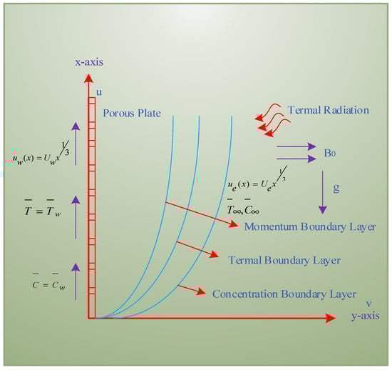 The esteem of the Maxwell fluid, which is appropriate to the rate of those kinds of fluids, is owing to its simplicity and ability to anticipate stress relaxation, as well as its tremendous behaviour in engineering and trade activity, particularly in the polymer areas. The research of [,,] provides appropriate information about Maxwell fluid. Various researchers have been interested in the flow issues with a stable or continually moving flat plate since the past century, because it has numerous technical applications in disciplines such as aerodynamics, naval architecture, and so on. Applying boundary layer theory, Sakiadis [] investigated the flow through a continually moving flat plate. Merkin [] explored free stream flow across a vertical flat surface, including the impacts of buoyancy forces. Wilks [] explained above a fixed flat upright surface the constant free stream flows in the semi-infinite field. Ghalambaz et al. [] analyzed the mixed convection boundary layer flow and heat transfer over a vertical plate embedded in a porous medium filled with a suspension of nano-encapsulated phase change materials. Similarly, S.A.M. Mehryan et al. [] explained the natural convection flow of a suspension containing nano-encapsulated phase change particles in an eccentric annulus. Because of buoyancy forces, the flow develops, and a continuous heat flux is delivered to the stationary upright plate. Bachok et al. [] explained the heat-transmission research of a comparable free stream flow owing to a sliding flat permeable plate. By using boundary layer estimation, Sadeghy et al. [] analyzed the Maxwell fluid flow across a moving flat plate. Damseh [] reported the flow of viscoelastic fluid across an infinitely porous perpendicular flat plate with first-order chemical effects. Nadeem et al. [] explained the MHD Maxwell Nano fluid flow across a flat plate in motion. With boundary coating estimations, Zhao et al. [] addressed the unsteady naturally convected Maxwell fluid flow through a perpendicular uniform surface. Utilizing boundary layer theory, Bhatti et al. [] investigated MHD Nano fluid flow through a porous stretched cylinder, as well as the impacts of heat radiation and chemical reactivity. With boundary coating flow assumptions, Bachok et al. [] explained the Nano fluid flow owing to a uniform moving surface. Employing boundary layer theory, we show the flow of magneto hydrodynamics Maxwell Nano fluid across an upright moving uniform permeable plate with impacts of heat and concentration buoyancy. With radiation and viscous dissipation results, heat-absorbing fluids have deliberated.