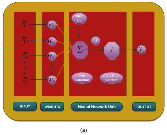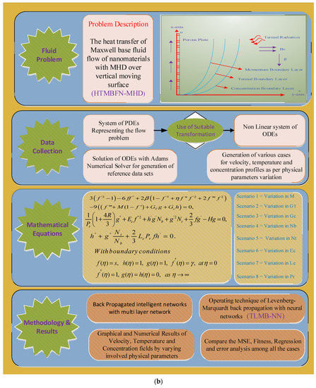 In the shape of a neural network structure, Figure 2 displays the suggested TLMB-NN model. The suggested TLMB-NN is accomplished by operating ‘nf tool’, i.e., in Mat lab’s neural network (NN) toolbox, setting a procedure for fitting NN tools, whereas the Levenberg–Marquardt with backpropagation is concluded, finding out the weight of neural networks. In Figure 3a, the suggested TLMB-NN model and the mathematical model along with concern geometry have displayed and in Figure 3b the overall elaboration of flow demonstration has presented, while the necessary details of the size and structure of the networks is tabulated in Table 1.