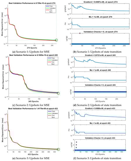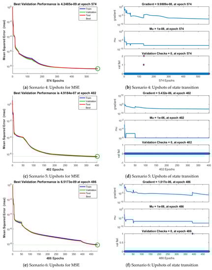 In Figure 4a,c,e, Figure 5a,c,e and Figure 6a,c,e for test processes, the convergence of MSE, validation, and training progressions for eight scenarios of the HTM-BFN model with MHD are considered. MSE nearby 9.7 × 10−10, 8.16 × 10−10, 1.41 × 10−9, 4.24 × 10−9, 4.91 × 10−7, 6.51 × 10−9, 1.03 × 10−9, and 2 × 10−9, with epochs 274, 245, 433, 574, 402, 486, 371, and 282, correspondingly, provided the finest network performance. The lower the MSE number, the more precise and effective the performance of the given approach may be. The estimates of step size Mu and Levenberg–Marquardt gradient are compactly (10−8, 10−8, 10−8, 10−8, 10−6, 10−8, 10−9, and 10−8) and (9.98 × 10−8, 9.97 × 10−8, 9.98 × 10−8, 9.98 × 10−8, 5.43 × 10−6, 1.01 × 10−6, 2.54 × 10−6, and 9.97 × 10−8) are presented in Figure 4b,d,f, Figure 5b,d,f and Figure 6b,d,f. The aforesaid outputs and graphical validations identify the authenticity that TLMB-NN is efficient, precise, and convergent for each case of HTM-BFN paradigm.