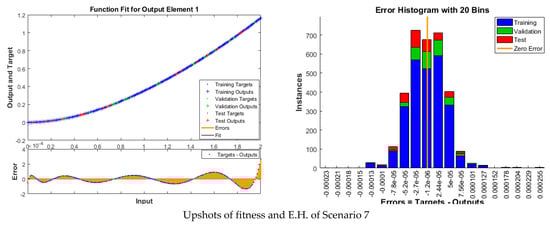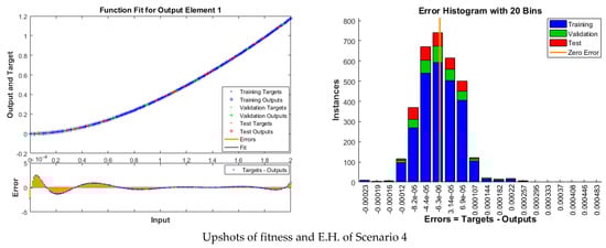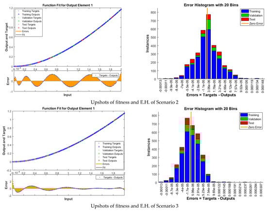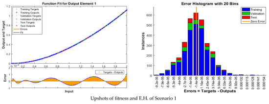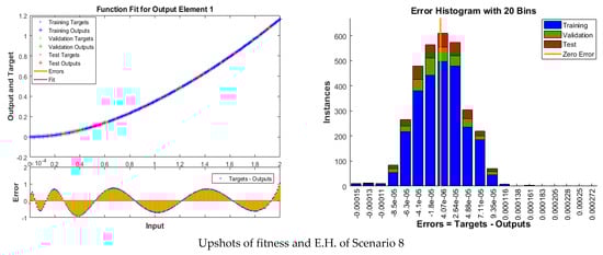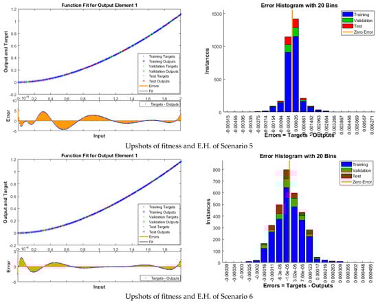 The TLMB-NN outcomes for the HTM-BFN model have been shown in Figure 4, Figure 5, Figure 6, Figure 7, Figure 8 and Figure 9 for different circumstances (scenarios) (1 to 8). Figure 4, Figure 5 and Figure 6 show the outcomes of eight scenarios in terms of performance and transition phases: , , , , , , , and . The fitting plots and error histograms in Figure 7, Figure 8 and Figure 9 were stated in terms of solution with error for four distinct situations, however, the regression estimations exhibited for four unique HTM-BFN model with MHD, collections in Figure 10, Figure 11 and Figure 12. In addition, for every HTM-BFN model scenario, Table 3 lists the convergence achieve parameter in terms of mean square error (MSE), execution, performed period, performance duration, back propagation, and temporal complexity gauges for scenarios 1 to 8.