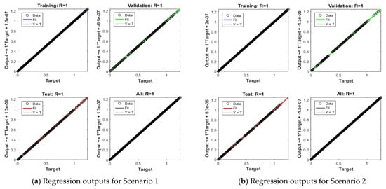 Regression performance of the proposed TLMB-NN for solving HTM-BFN model with MHD of Scenarios 1 and 2.