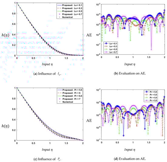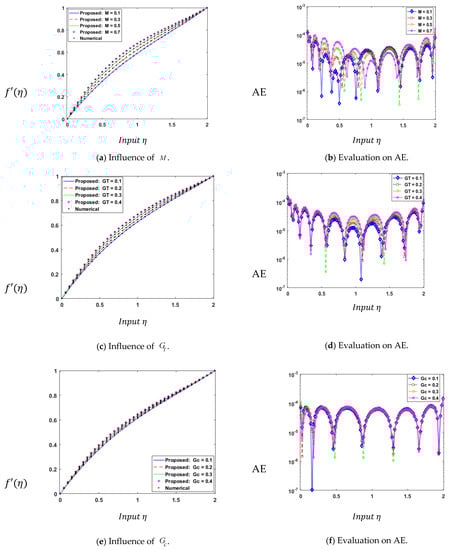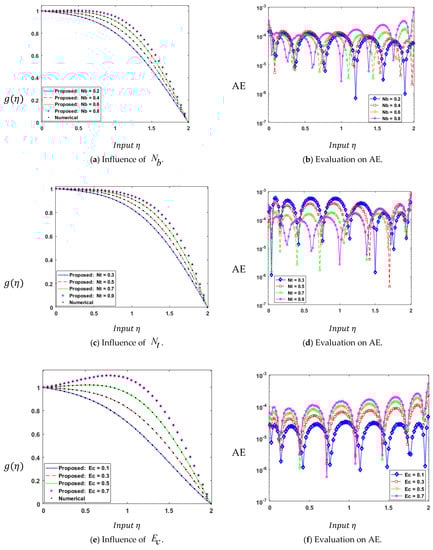 Figure 14a,c,e illustrates graphs of velocity versus various physical parameter values. As seen in Figure 14a–c, the velocity increases in magnitude by increasing the values of , and . Figure 14a depicts the alteration in Hartmann number for velocity distribution. When the magnetic field’s effect is increased, the flow accelerates, causing the velocity distribution to accelerate. The influence of thermal Grashof number and concentration Grashoff parameter on velocity distribution is explained in Figure 14c,e, and we detect that the velocity increases when and magnitudes escalate. There might be some overlapping between the reference and proposed solutions. As a conclusion, for scenarios (4, 5, and 6) of the HTM-BFN model, Figure 15a,c,e illustrate the results of different magnitudes for Brownian motion parameter , Thermophoresis parameter , and Eckert number for temperature profile In Figure 15b,d,f the appropriate values of AE are determined. As demonstrated in Figure 8a,c, both the parameters and have the same influence on the temperature distribution, as temperature rises with improving values of these parameters. Furthermore, due to thermophoresis and Brownian motion, the temperature is increased by adding more heating when the nanoparticles and fluid reach a specific point. As a result, the thermal barrier layer thickens, increasing and values, and the temperature near the permeable sheet swiftly rises. As the Eckert number has been raised, the temperature profile accelerates, as seen in Figure 8e. Moreover, the results reveal a consistent overlap between the recommended and reference outcomes. For scenarios 7 and 8, Figure 16a,c depicts the impact of the concentration profile for various values of physical parameters, however, Figure 16b,d depicts the suitable value of AE. Figure 9a,c shows that raising the Lewis number and the Prandtl number lowers the concentration profile . This observation also demonstrates that the suggested and reference solutions are always overlapping.