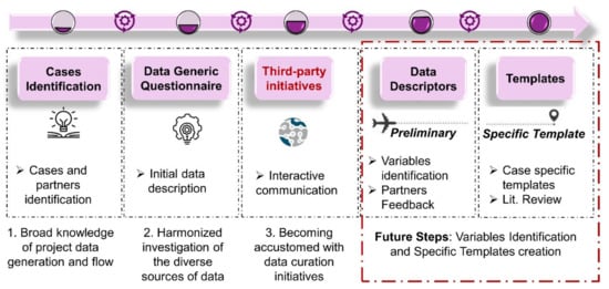 With the assistance and supervision of the data shepherd, we show the process from the recommended framework to template construction, with a focus on antimicrobial measures. The goal of the data compilation in this case was to keep track of the characterization data and the conditions of exposure and assessment for the antimicrobial study of NMs/NEPs in the ASINA supply chain []. The scientists (data creators) that processed and analyzed these materials were detected and a preliminary survey was circulated between the participants in order to gather information about the data to be generated (see Section 3.1). We exhibit how we moved from the preliminary questionnaires to the usage of the introductory template (see Section 3.2). We reveal the outcomes of the internal communications between partners about minimal data needs and descriptors selection, which resulted in a project consensus and the co-created template (see Section 3.3). Finally, we annotated the dataset to enhance the interoperability (see Section 3.4).