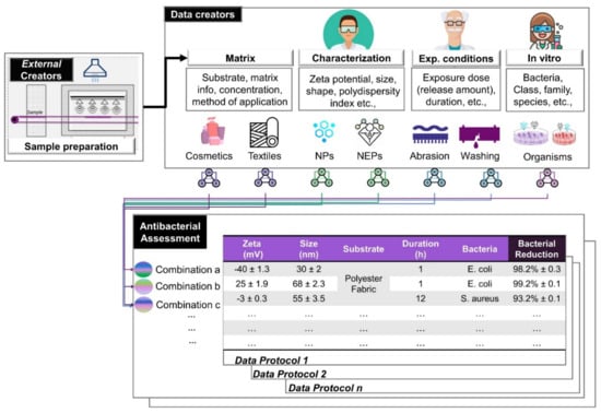 The importance of the variables is determined by stakeholder expertise and is required to meet project objectives. Antimicrobial assessment, for example, necessitates knowledge of exposure variables, such as NM concentrations, which characterize antimicrobial capacity. Antimicrobial assessment, in combination with p-chem properties, the bacteria being exposed and the experimental conditions (including protocols and instrumentation), can provide insights into the factors that affect the antimicrobial capacity. These insights can be used to construct datasets that will enable the prediction of the antimicrobial capacity of NMs/NEPs, thus avoiding the need for excessive experimental assessments. Internal communication with expert partners within the consortium revealed that the biological interactions of NMs with bacteria or viruses were difficult to predict from the experimental data. The same NMs prepared with slight variations but the same size distribution, ion release and zeta potential resulted in different antibacterial functionality. The foregoing emphasizes the importance of preserving more data. To understand the antimicrobial determinants, which are crucial for model building, high-quality data is required. We assembled the requirements for a demo scenario of antimicrobial evaluation and the relevant stakeholders to visualize the information that is presented in the above template (Figure 3).