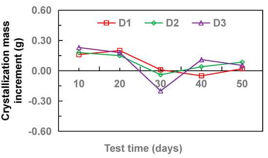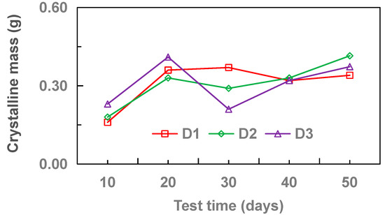 Figure 6 indicates that the variation in the mass of crystals in the 20-mm pipe (D1) was characterized by a fast increase in the early phase followed by gradual stabilization with time. The curves of all three types of pipe showed a negative growth, indicating that the pipe wall played a role in weakening the crystallization for a certain period of time. The mass of crystals in the 32-mm pipe (D3) experienced the largest negative growth, reaching 0.2 g, which was 20 and 5 times the negative growth in the 20-mm and 25-mm pipes, respectively. In addition, Figure 6 shows that for all types of pipe, the mass of crystals started to increase abruptly after reaching the minimum negative growth. During the test, there was initially a large interaction between the crystals and the pipe wall, which was favorable to the formation of crystals. In a later phase, the interaction between the CaCO3 crystals and the pipe wall was surpassed by the interaction between the CaCO3 crystals themselves, which mainly played a repulsive role. Under the continued action of water flow, the presence of friction reduced the originally formed crystals, thereby resulting in the phenomenon of negative growth. As the circulation test proceeded, the surface of crystals was covered continuously by other tiny particles and impurities in the solution, thereby resulting in growth again in the later phase. The above process occurred cyclically during the test.