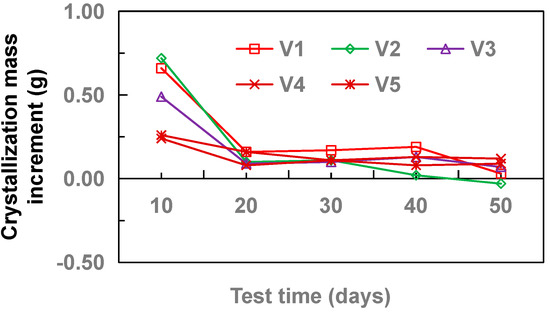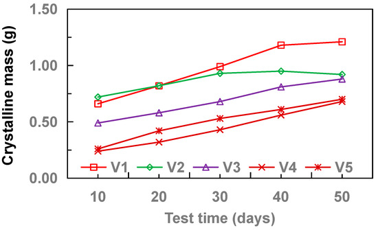 Figure 7 shows that, overall, the rate of crystallization was faster in the pipes with a low flow velocity than in the pipes with a high flow velocity. Specifically, the results reveal the following: (1) Under a flow velocity of 22 cm·s−1, the difference between the maximum and minimum crystal mass was 0.55 g; and the maximum was 1.83, 1.32, 1.8, 2.83, and 2.69 times the minimum for flow velocities of 26.5 cm·s−1, 34.5 cm·s−1, 44.5 cm·s−1, and 63.5 cm·s−1, respectively. (2) Under the influence of each flow velocity, the mass of crystals first increased, then reached the saturated state in the later phase, and remained stable, with the crystallization rate slowing down gradually. In the early phase, there was a high interaction force between the pipe wall and the CaCO3 crystals, resulting in the attachment of a large mass of crystals to the pipe wall and the gradual accumulation of impurities in the solution. In the later phase, the interaction between the CaCO3 crystals and the pipe wall was no longer dominant, and its effect gradually weakened. Meanwhile, the precipitates on the wall were rounded under the continuous impact of the water flow, so the change in mass was very small. Figure 8 shows that the phenomenon of negative growth in the mass of crystals occurred only under a flow velocity of 26.5 cm·s−1, exhibiting a negative growth of 0.03 g, i.e., on the order of magnitude of 0.01 g, which was very small compared to the order of magnitude of 1 g under a flow velocity of 26.5 cm·s−1. There was a large fluctuation in the mass of crystals in the pipes with a high flow velocity.