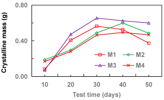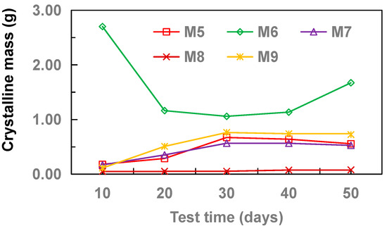 Figure 11 reflects the variation trend in the mass of crystals in pipes made of different modified materials with time. The mass of crystals in the pipe using a magnetic field coil (M8) was always smaller than the mass in the pipes using different modified materials, indicating a significant modification effect; the maximum mass of crystals (0.075 g) was 1.5 times the minimum (0.05 g). The minimum mass of crystals was mainly due to the directional movement of Ca2+ and HCO3− in the circulating water under the action of the electromagnetic field generated by the current, which thus interfered with their mutual binding. The curve of the flocking film (M6) pipe is apparently above the curves of other pipes, indicating that the mass of crystals in this pipe was much larger than that in the pipes using other types of modified materials; the maximum mass of crystals reached 2702 g, which was 2.55 times the minimum of 1058 g. The mass of crystals in this pipe was the largest mainly because the villi were negatively charged and interacted strongly with the substances in solution. In addition, the presence of villi greatly increased the contact area, so other substances in solution continuously accumulated as the water flowed through the pipe. For these two reasons, the mass of crystals in the flocking film (M6) pipe was much larger than that in the pipes using other modified materials. The other three modified materials had very similar modification effects, with the effect of polyethylene (PE) powder (M9) being slightly less than that of the hydrophobic material (M5) and silicone (M7).