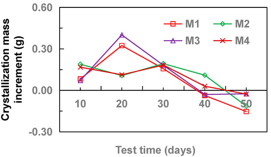 As shown in Figure 9, the trends of the effects of the different pipe materials on CaCO3 crystallization were approximately the same, i.e., there was always an initial stage of increase followed by a stage of decrease. In the increasing stage, the interaction between the CaCO3 crystals and the pipe wall was dominated by attraction in the early phase, and there was an accumulation of other impurities in the solution, resulting in an increase in the mass of crystals. Specifically, in the case of the PVC (M1) pipe, the mass of crystals reached the maximum of 0.564 g on day 30, which was 6.8 times the corresponding minimum of 0.083 g; for the polypropylene random (PPR) (M2) pipe, the mass of crystals attained its maximum of 0.599 g on day 40, which was 3.2 times its minimum of 0.189 g; for the polytetrafluoroethylene (PTFE) (M3) pipe, the mass of crystals reached the maximum of 0.655 g at day 30, which was 9.1 times the minimum of 0.072 g; and for the HDPE (M4) pipe, the mass of crystals reached the maximum of 0.494 g on day 40, which was 2.94 times the minimum of 0.168 g. After running the test for a period of time, the mass of crystals reached the maximum, and then repulsion became dominant instead of attraction. However, as the test continued, the impurities in the solution and the previously formed crystals interacted with each other through extrusion and friction, which rounded them and resulted in a decreasing process. Overall, the mass of crystals in the PTFE (M3) pipe was higher than that in the other types of pipe and thus did not meet our goal of reducing CaCO3 crystallization. Considering the economic cost, the use of PVC (M1) pipe is recommended. In addition, Figure 10 shows that the PVC (M1) pipe achieved the largest negative growth, with a steep slope of change. During the period of day 10 to day 20, there was a positive increase in the variable value for all pipes, with the largest increase (0.401 g) occurring in the PTFE (M3) pipe, and the smallest increase (0.107 g) occurring in the PVC (M1) pipe, indicating that there was a process of aggregation in each pipe in the early phase. Overall, the largest negative growth (0.153 g) occurred in the PVC (M1) pipe between day 40 and day 50, during which the increase in each parent material was less than 0 g.